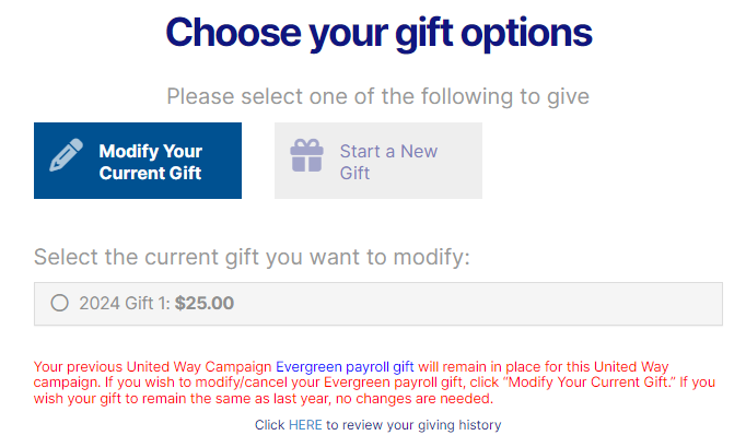 When you click donate you will be presented with the following options. Click MODIFY YOUR CURRENT GIFT.